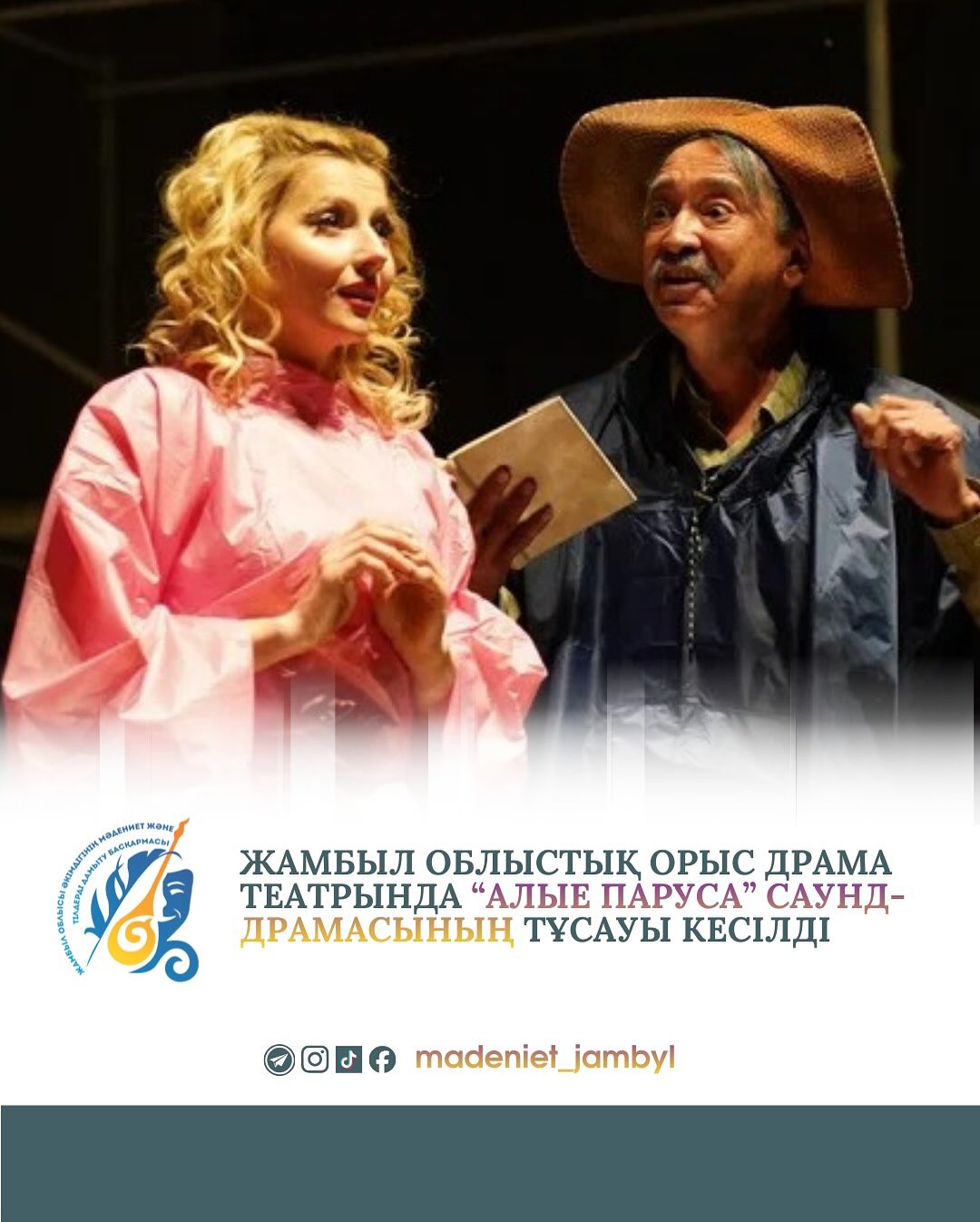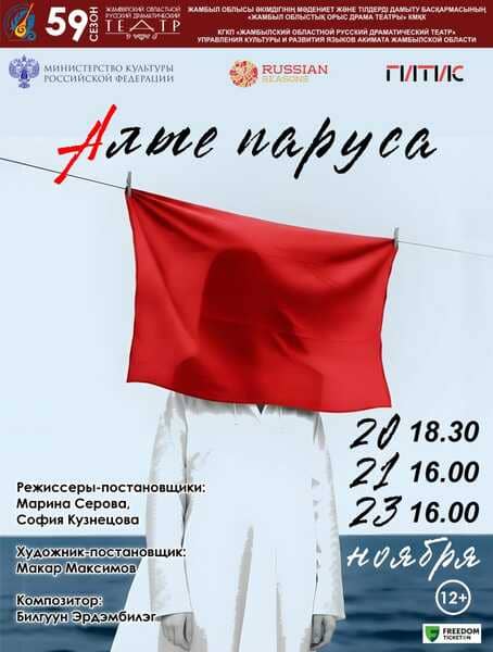 Приглашаем вас на ПРЕМЬЕРУ спектакля «АЛЫЕ ПАРУСА» по повести-феерии Александра Грина, который реализован при поддержке Фонда образовательных программ Министерства культуры Российской Федерации АНО «Русские сезоны» и Управления культуры и развития языков акимата Жамбылской области
