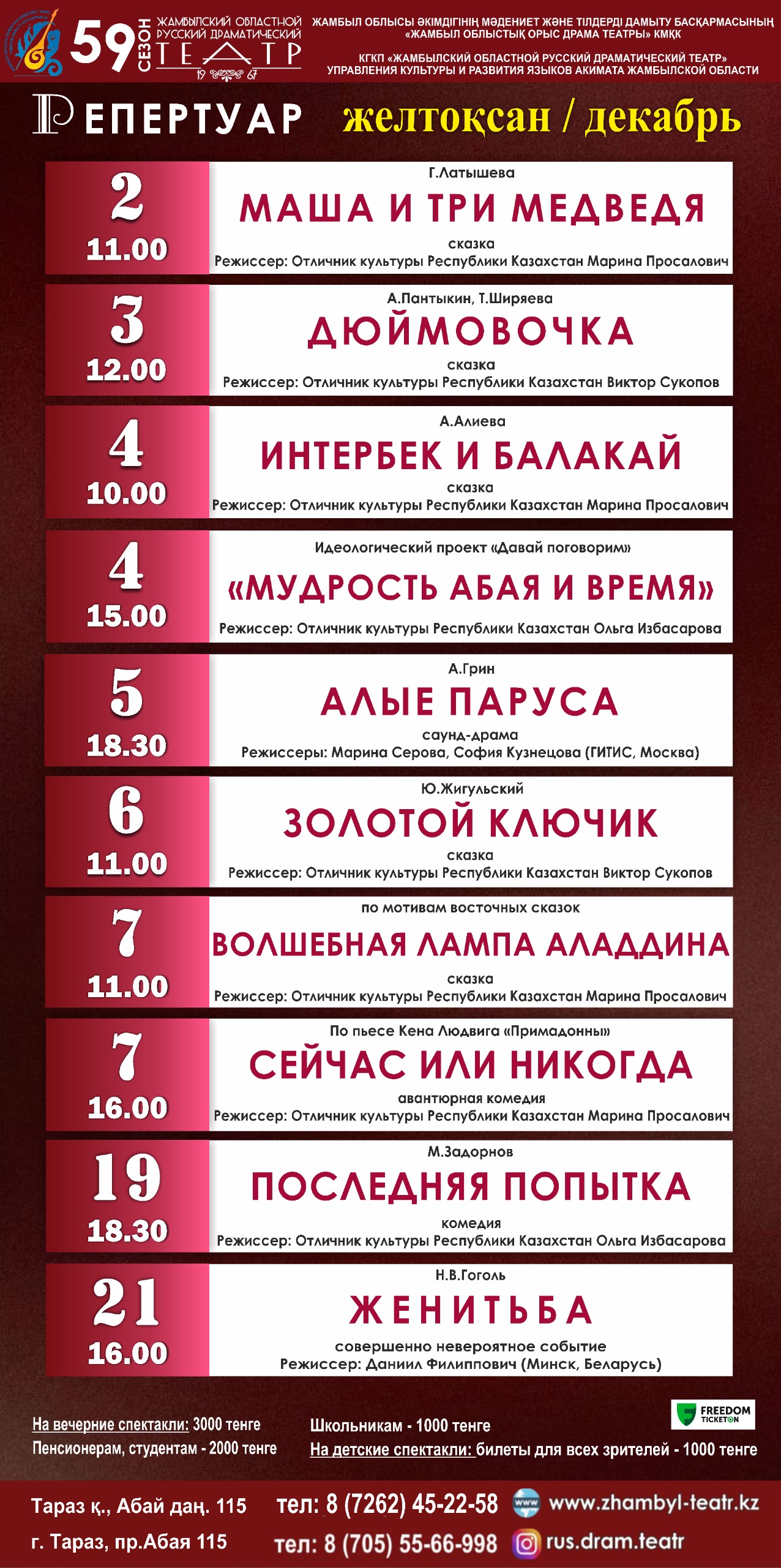 Вечерние спектакли - 3000 тг.