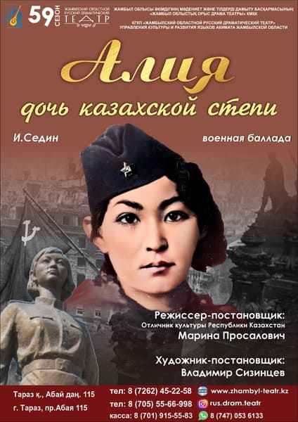«Алия — дочь казахской степи» по пьесе Игоря Седина — это военная драма, основанная на реальной биографии легендарной девушки-снайпера, Героя Советского Союза Алии Молдагуловой. История её жизни представлена через её собственное восприятие: воспоминания о детстве, дороге на фронт, суровом военном быте, испытаниях и фронтовых буднях. Зритель видит сослуживцев её глазами — как товарищей, боевых братьев и сестёр, разделивших с ней тяжесть и горечь войны. Пьеса бережно следует фактам биографии Алии, не искажая исторической правды, и в то же время стремится передать её внутренний мир, силу духа и ту атмосферу, в которой формировалась её личность. Это история не только о подвиге, но и о становлении молодой девушки, выбравшей путь мужества и самопожертвования ради Родины. Спектакль — дань памяти и уважения, попытка сохранить живым образ Алии Молдагуловой и передать его новым поколениям в его подлинности и человеческой глубине.