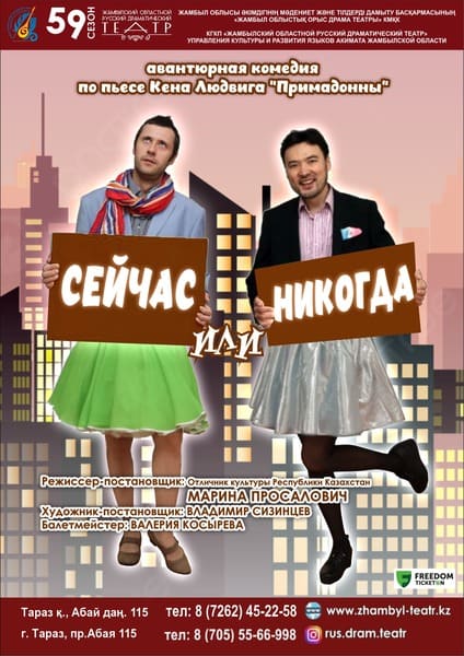 Авантюрная комедия "Сейчас или никогда" по пьесе «Примадонны» Кена Людвига — это остроумная, лёгкая и стремительная история о том, сколько готов человек сделать ради успеха… и любви. Джек и Лео — два безработных актёра, мечтающие о сцене и славе. Неожиданно они узнают, что богатая старушка собирается разыскать своих давно потерянных племянниц, чтобы передать им многомиллионное наследство. Поняв, что у них может не быть конкурентов, Джек и Лео принимают смелое решение: выдать себя за племянниц! На сцене — калейдоскоп переодеваний, неожиданных поворотов и смешных ситуаций, но сквозь весь фарс проходит теплый человеческий стержень: игра — не просто прикрытие, а способ выражения себя и поиска настоящего счастья.