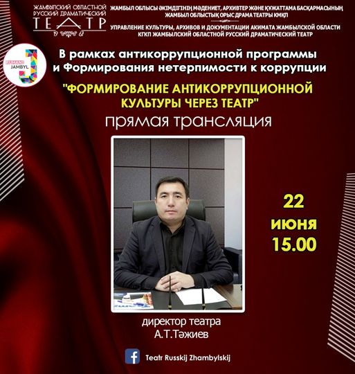 22 июня в 15:00 состоится прямой эфир с директором Жамбылского областного русского драматического театра Акылдосом Тәжиевым, в рамках Антикоррупционной программы и Формирования нетерпимости к коррупции.